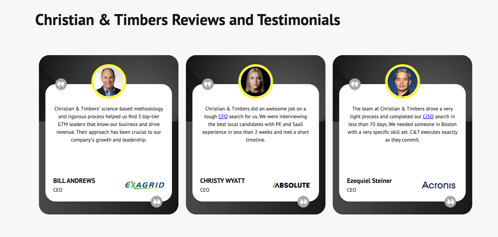 Christian & Timbers has earned the trust of some of the most respected names in technology investment and operations. Industry leaders, including Andy Geisse (Operating Partner, Bessemer Venture Partners), Barbara Massa (Partner and COO, NightDragon), Joe De Pinho (Partner, Riverwood Capital), Bill Andrews (CEO, ExaGrid), and Christy Wyatt (CEO, Absolute Security) have all spoken publicly about their experience with the firm. Common themes across their accounts are speed, methodological precision, a refusal to push candidates who are not the right fit, and search processes that delivered against a tight brief. Several of these client relationships span more than two decades.