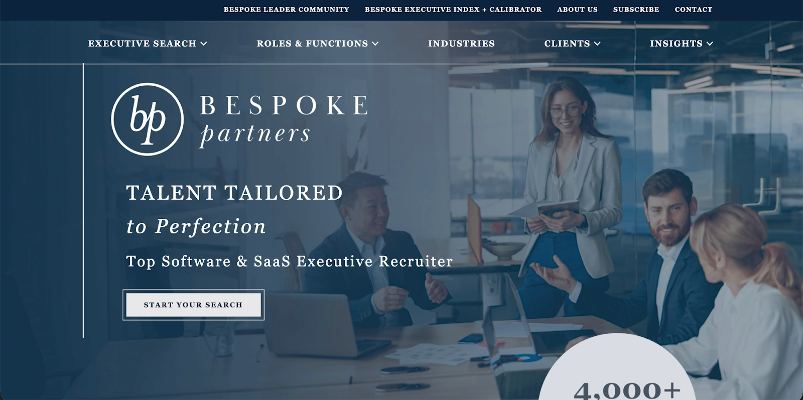Their Search 2.0 process is data-driven, mapping executive recruitment directly to the PE firm's value creation plan. This reduces human capital risk significantly. Bespoke reports a 95% placement success rate, completes searches in roughly half the industry-average time, and conducts more than 10 backchannel references per candidate before a shortlist is finalized. Their expertise spans cybersecurity, healthcare, online retail, supply chain, and financial services.